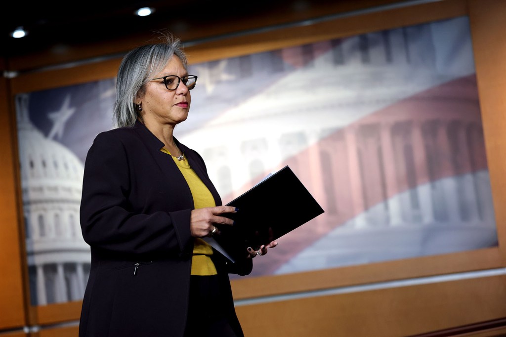 Rep. Robin Kelly arrives for a news conference on Capitol Hill on January 14, 2026 in Washington, D.C.